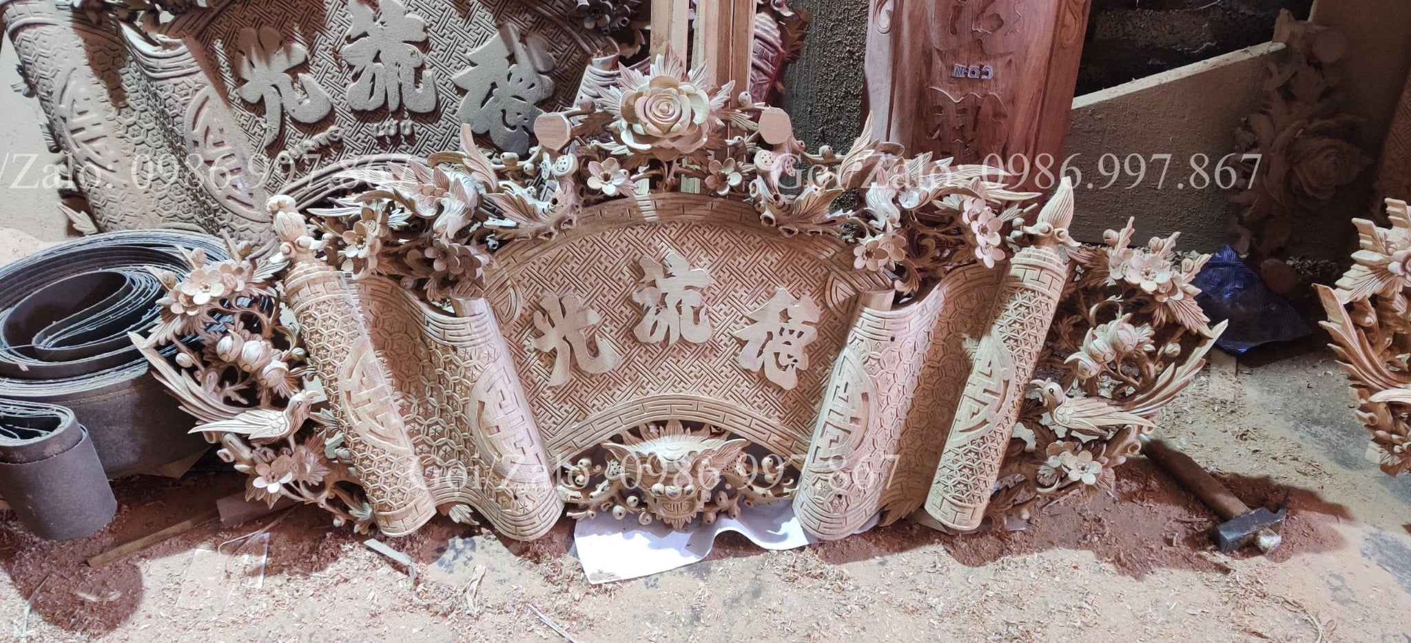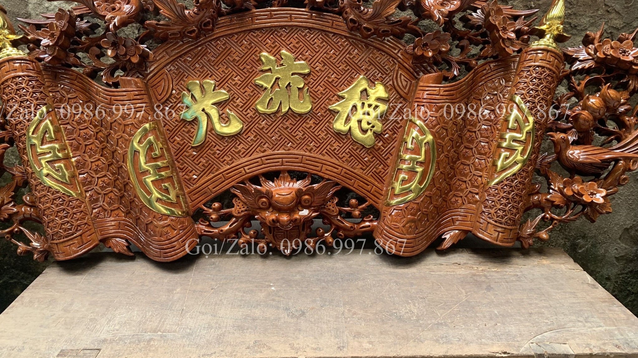| Quy cách | - Bộ cuốn thư được đục sắc nét, kênh bong Từng chi tiết trên bộ cuốn thư, được đục thủ công, tỷ mỷ - Đục chạm rồng - Gỗ nguyên khối |