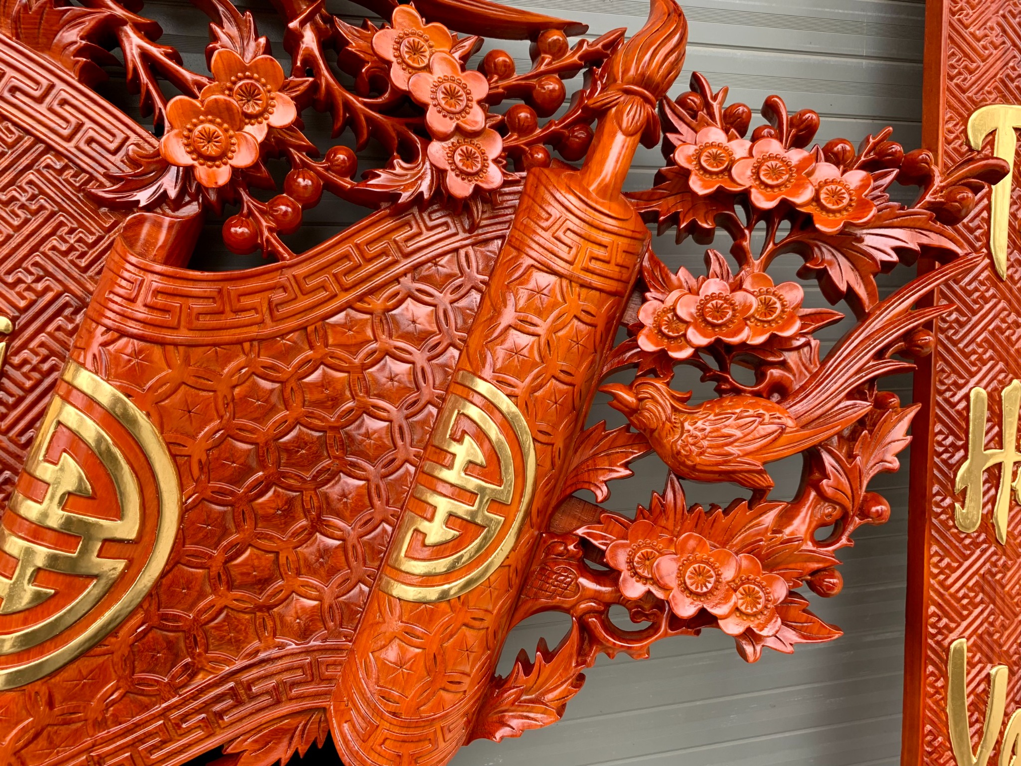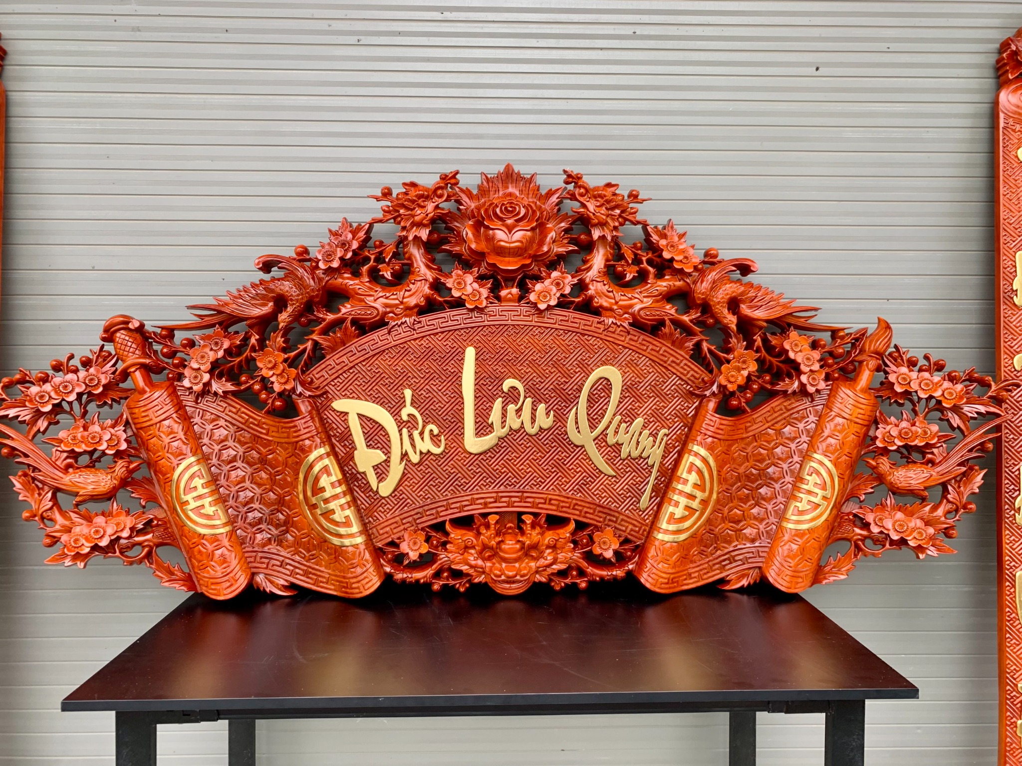 | Quy cách | - Bộ cuốn thư được đục sắc nét, kênh bong Từng chi tiết trên bộ cuốn thư, được đục thủ công, tỷ mỷ - Đục chạm rồng - Gỗ nguyên khối |