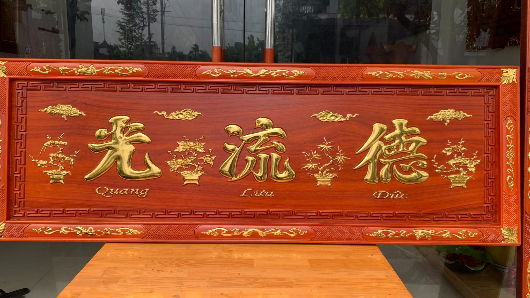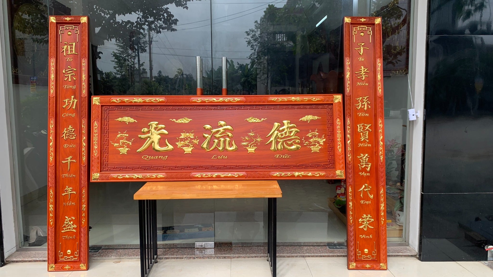 • Vị trí đễ treo hoành phi câu đối gỗ là đặt ngay ngắn nơi chính giữa hoặc vị trí trang trọng của ngôi nhà trên bàn thờ chính và hướng ra bên ngoài cửa. Vị trí của hoành phi câu đối cần được cố định và ít di chuyển tạo cảm giác trang nghiêm và bền vững.