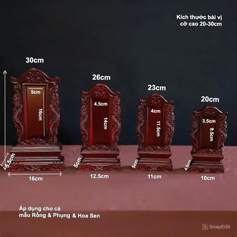 Được chế tác từ gỗ quý tự nhiên, bài vị gỗ không chỉ là vật phẩm thờ cúng trang nghiêm mà còn là nơi lưu giữ tên tuổi, công đức của tổ tiên. Với đường nét chạm khắc tinh xảo, kiểu dáng chuẩn phong thủy, bài vị gỗ mang đến sự tôn kính và trang trọng cho bàn thờ gia tiên – giúp gia chủ thể hiện lòng hiếu đạo và giữ gìn nét đẹp truyền thống.