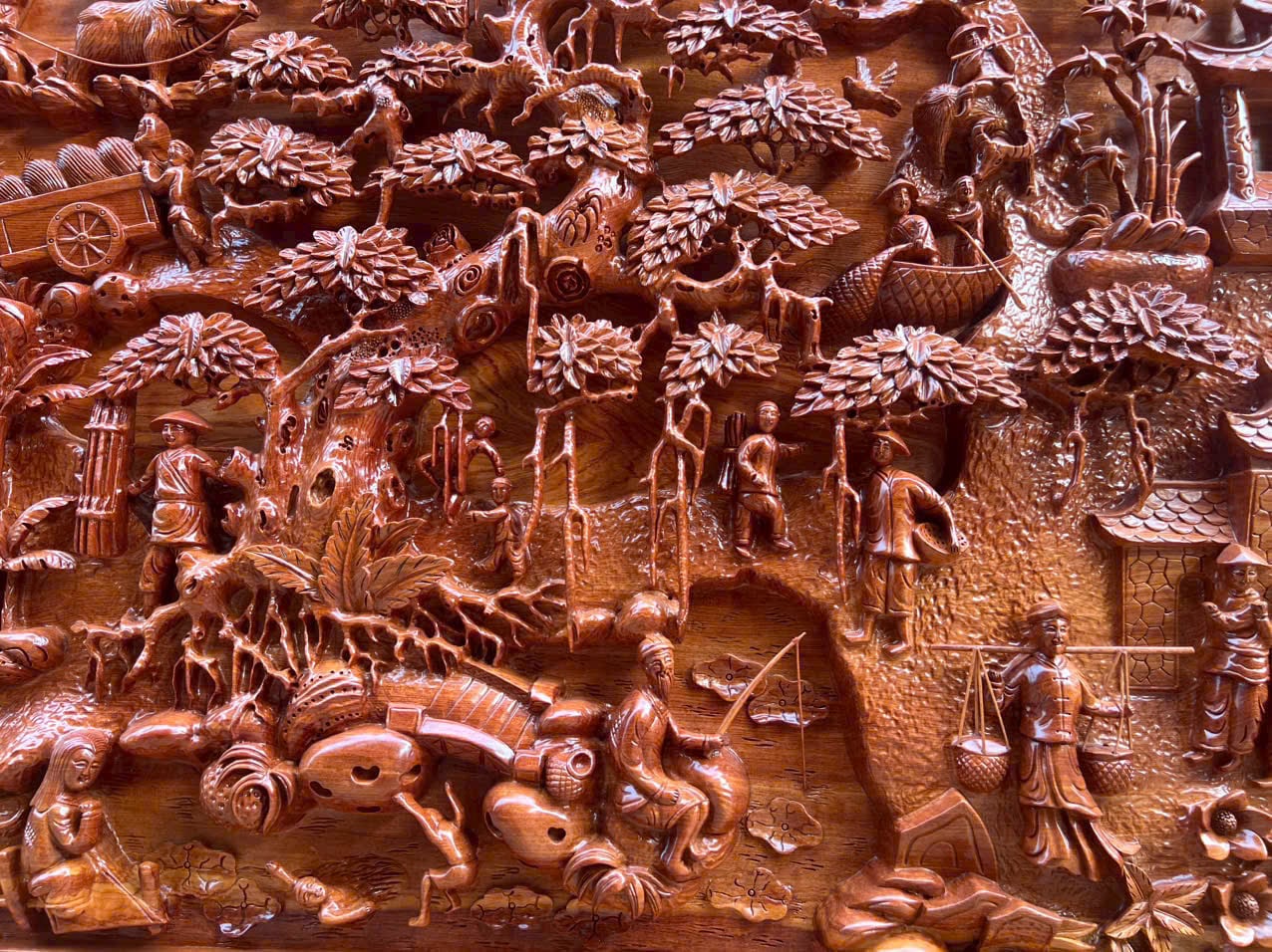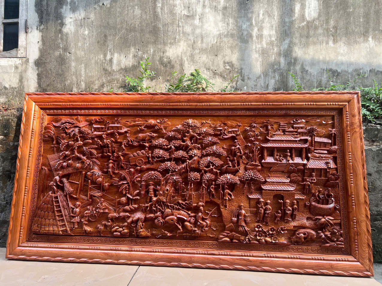 | Quy cách | - Tranh được đục sửa tay kênh bong vô cùng sắc nét, Từ đôi bàn tay nghệ nhân nổi tiếng của Làng Nghề - Ván nguyên khối, khung ghép - Gỗ chuẩn, không rác, không sâu, không mắt gỗ, gỗ khô, không cong vênh - Gỗ hương đá siêu vân. Vân gỗ đẹp tự nhiên, hài hòa |