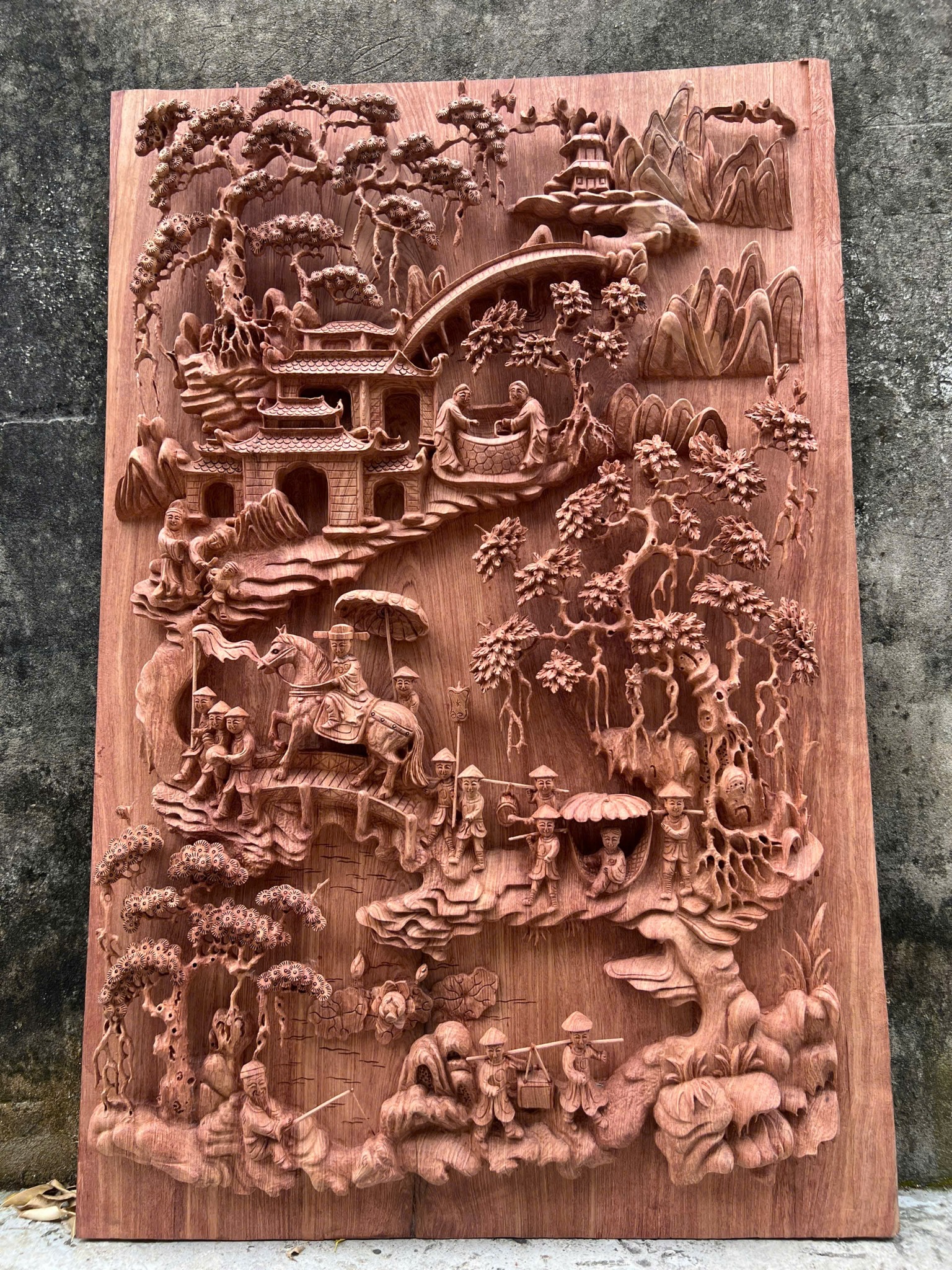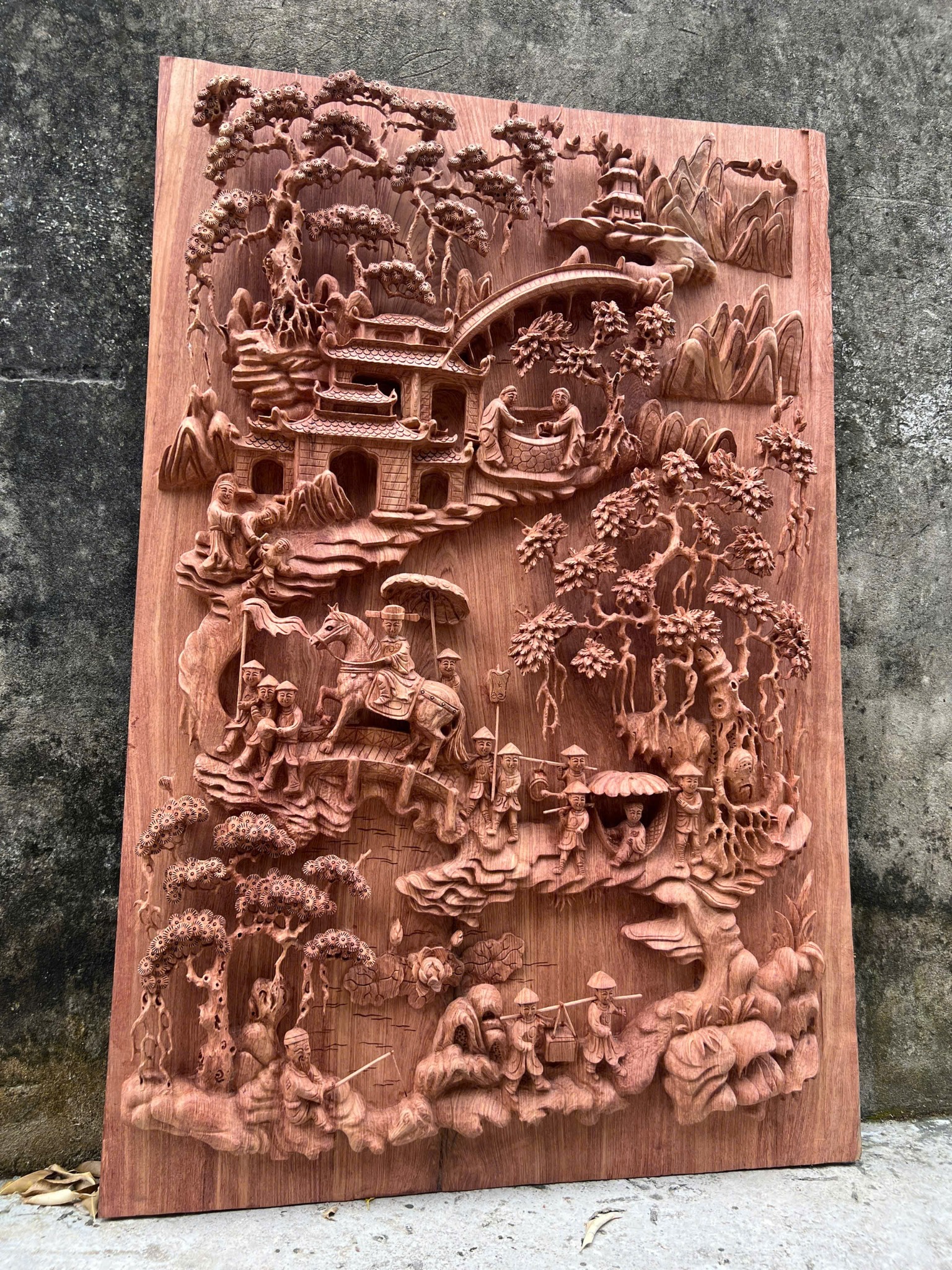 • Tranh gỗ vinh quy bái tổ được người nghệ nhân chạm khắc tỉ mỉ đến từng chi tiết. Bề mặt được mài nhẵn thẩm mĩ mà không hề "thô" như mọi người vẫn thường nghĩ. Hơn thế, bên ngoài được bao bọc bởi khung gỗ được phủ sơn chuyên dụng đảm bảo sự cân đối cho sản phẩm.