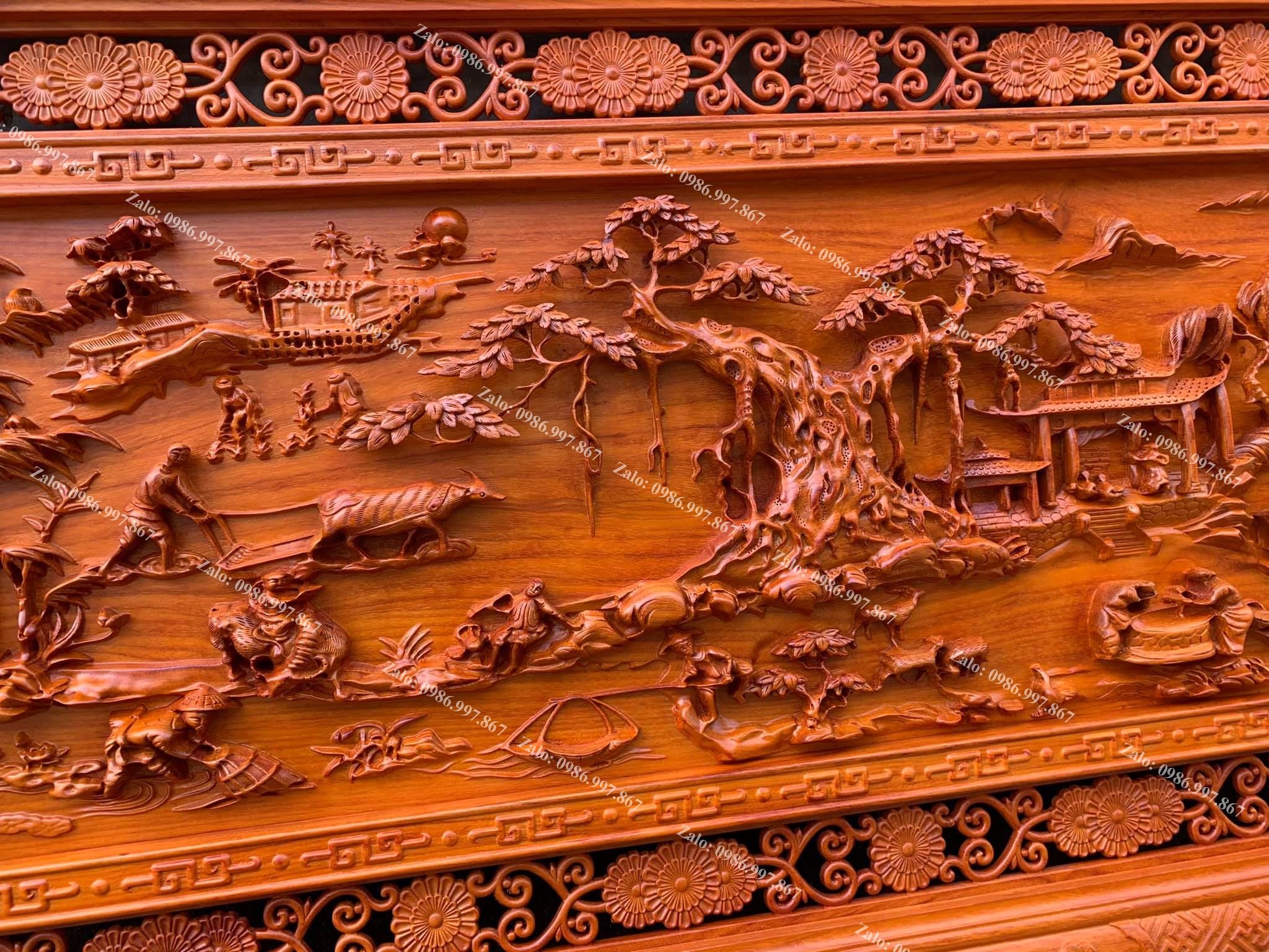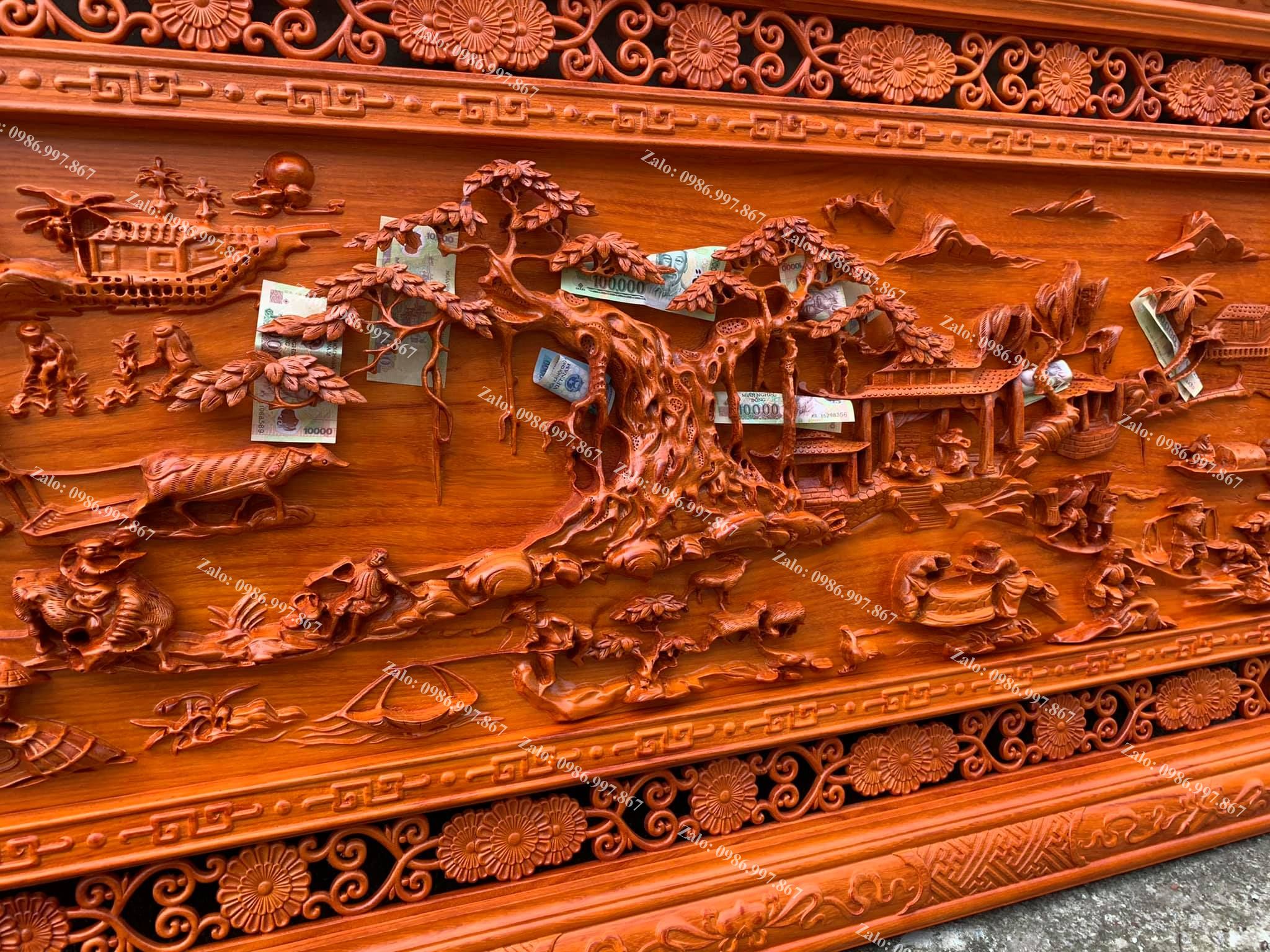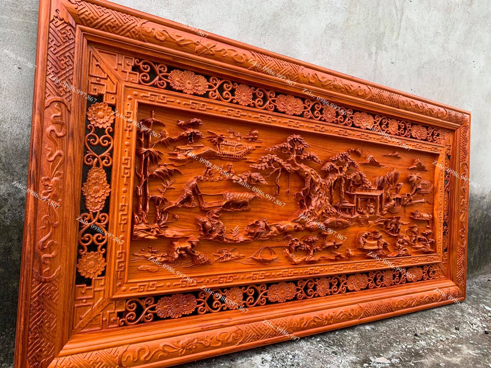 | Quy cách | - Tranh được đục sửa tay kênh bong vô cùng sắc nét, Từ đôi bàn tay nghệ nhân nổi tiếng của Làng Nghề - Ván nguyên khối, khung ghép - Gỗ chuẩn, không rác, không sâu, không mắt gỗ, gỗ khô, không cong vênh - Gỗ hương đỏ siêu đẹp |