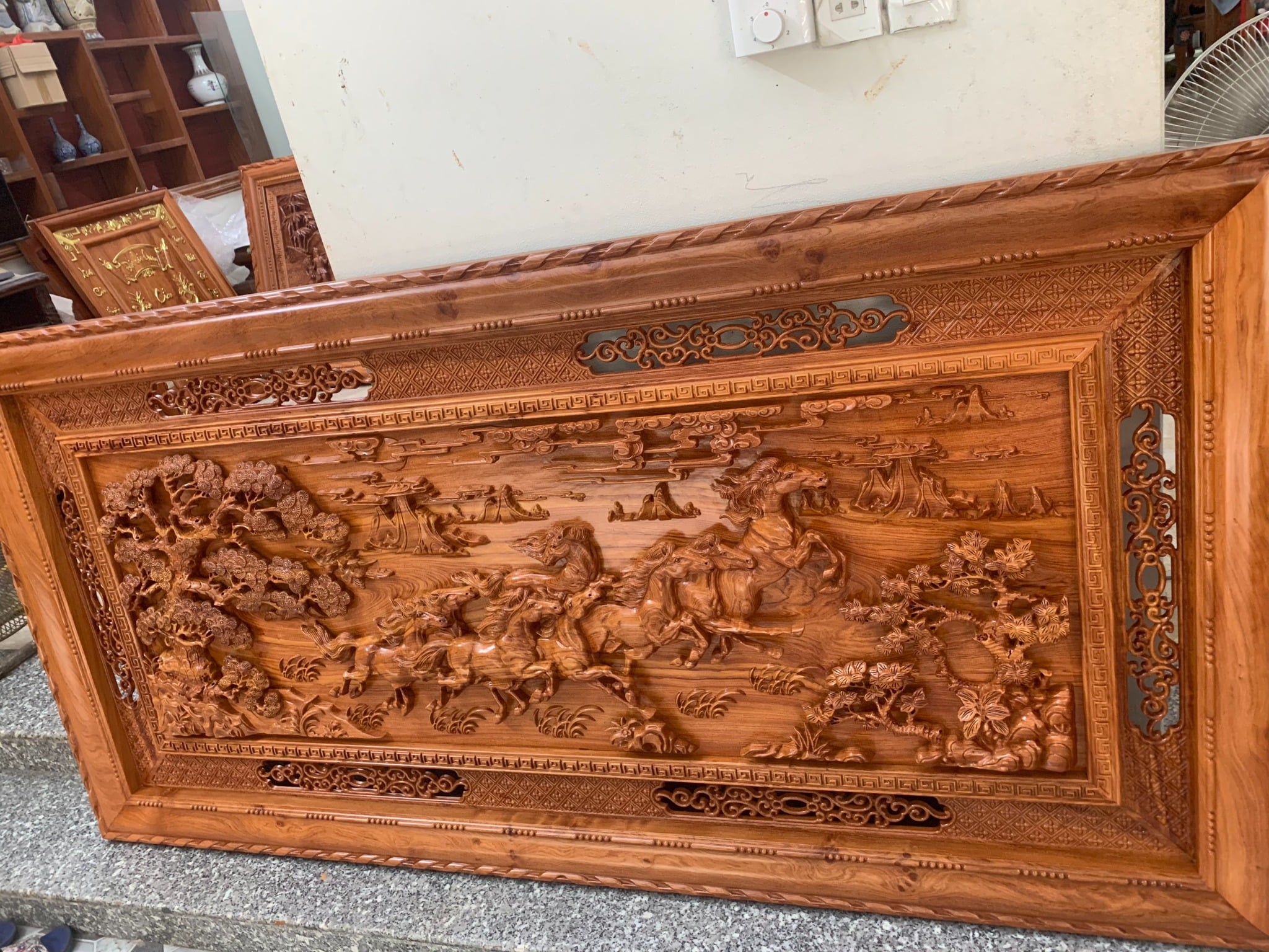 | Quy cách | - Tranh làm bằng ván gỗ nguyên tấm, vân gỗ tự nhiên đẹp mắt - Khung tranh bản 10 - Ván liền, khung ghép - Đục sắc nét từ đôi bàn tay nghệ nhân nổi tiếng tạo nên thần thái của bức tranh |