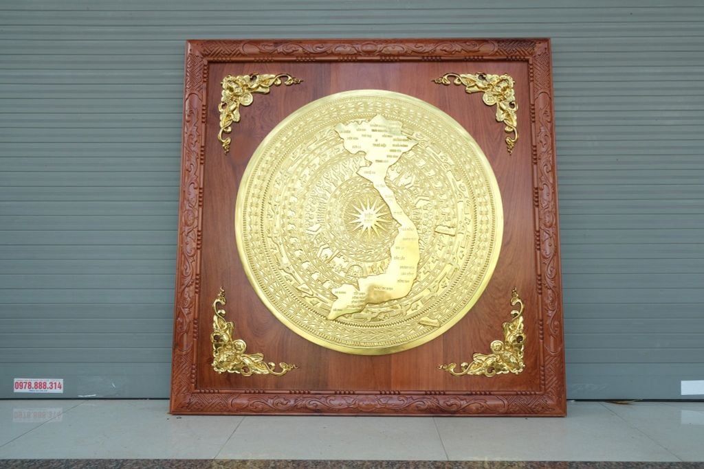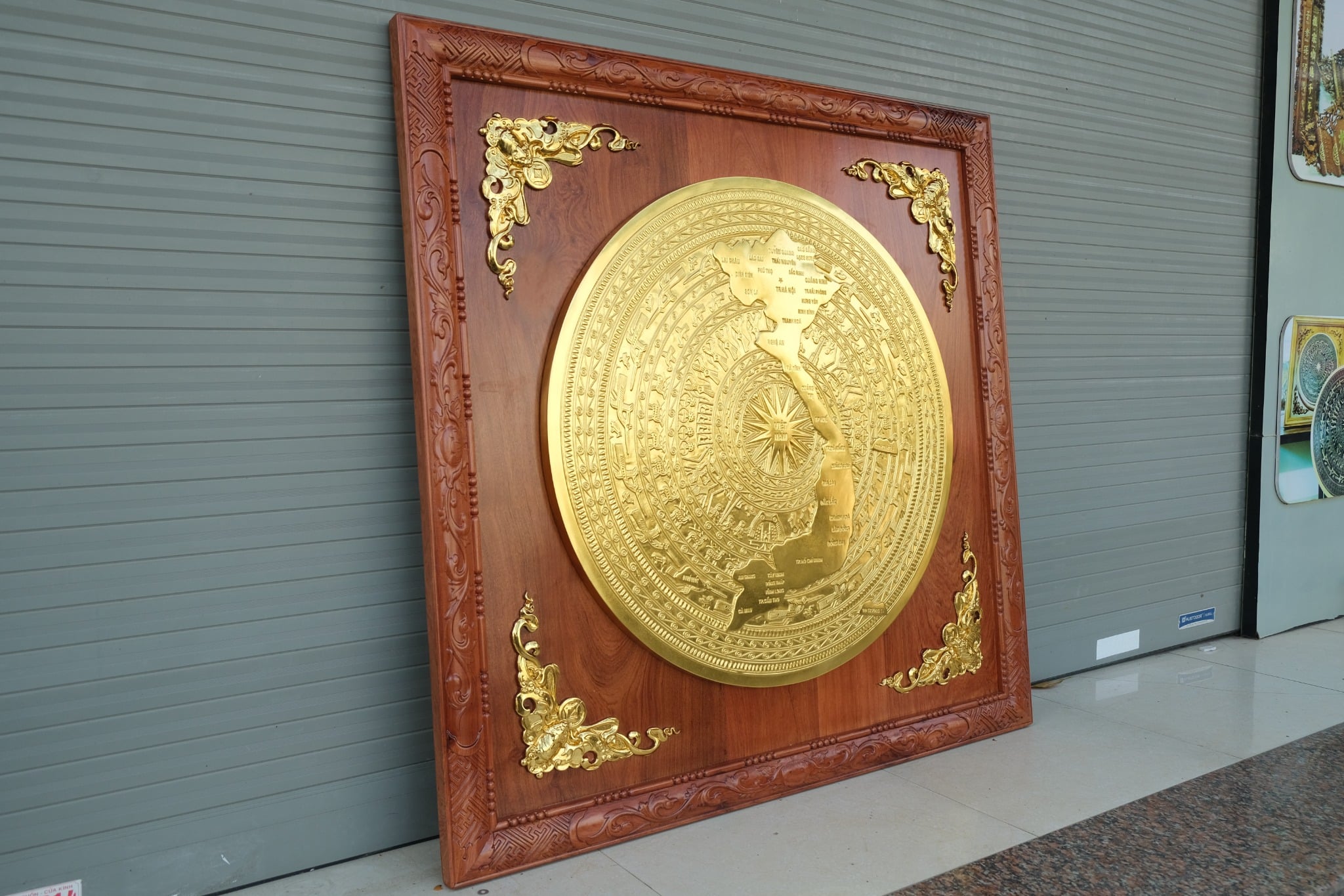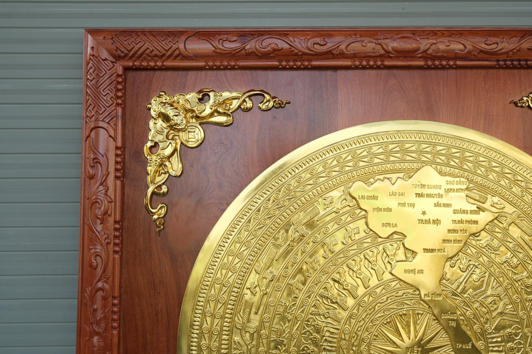 | Quy cách | - Khung tranh làm bằng gỗ hương đá - Bo góc dơi ngậm tiền dát vàng liên khung gỗ - Mặt trống được làm bằng đồng đỏ đúc thủ công, hàng liền khối. Bảo hành chất lượng đồng vĩnh viễn - Toàn bộ được dát vàng 18k |