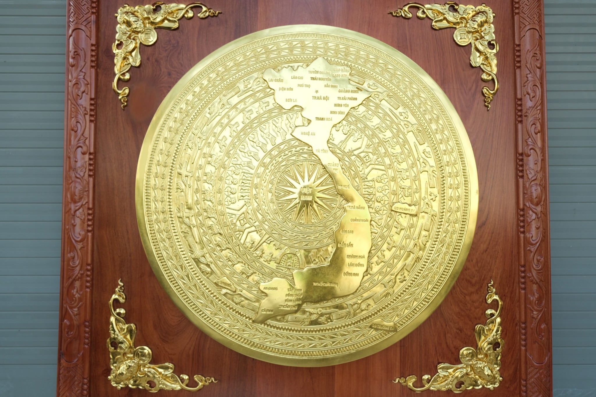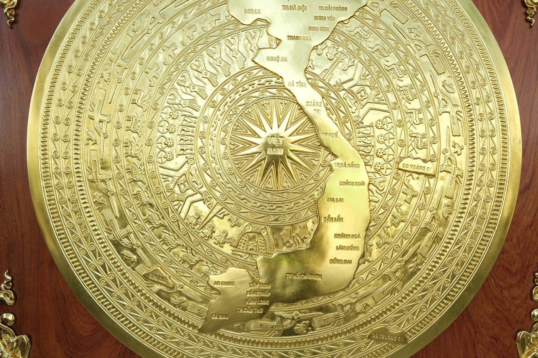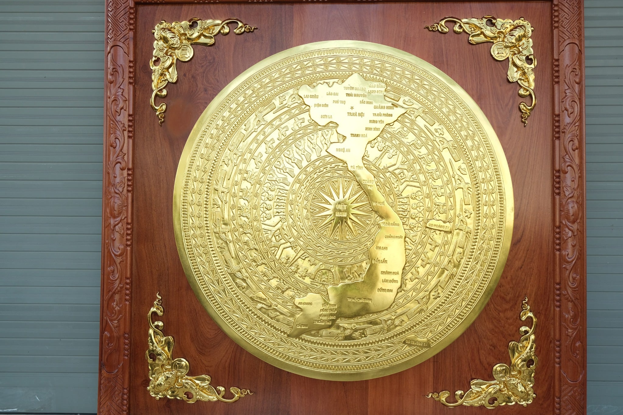 | Quy cách | - Khung tranh làm bằng gỗ hương đá - Bo góc dơi ngậm tiền dát vàng liên khung gỗ - Mặt trống được làm bằng đồng đỏ đúc thủ công, hàng liền khối. Bảo hành chất lượng đồng vĩnh viễn - Toàn bộ được dát vàng 18k |