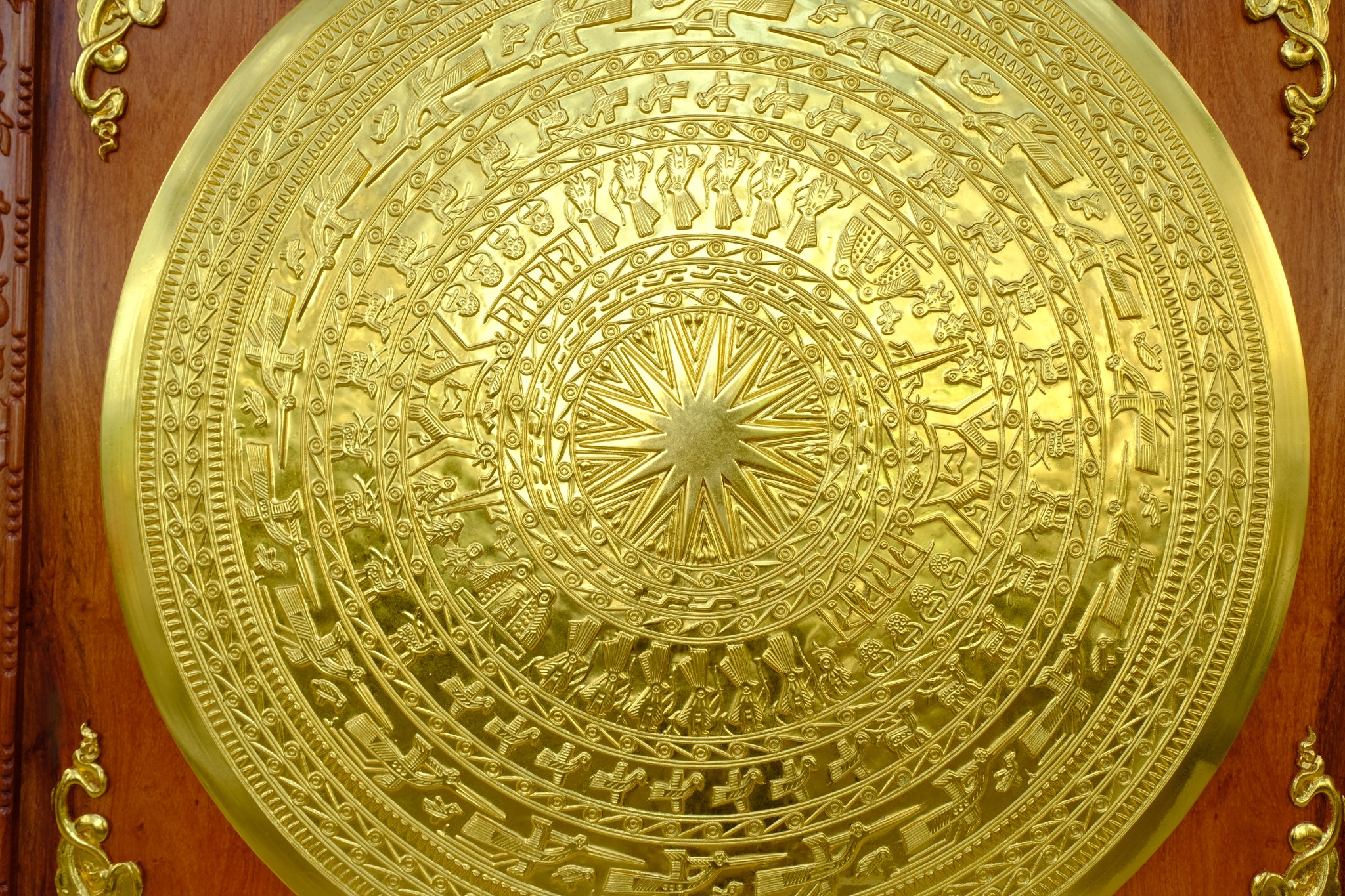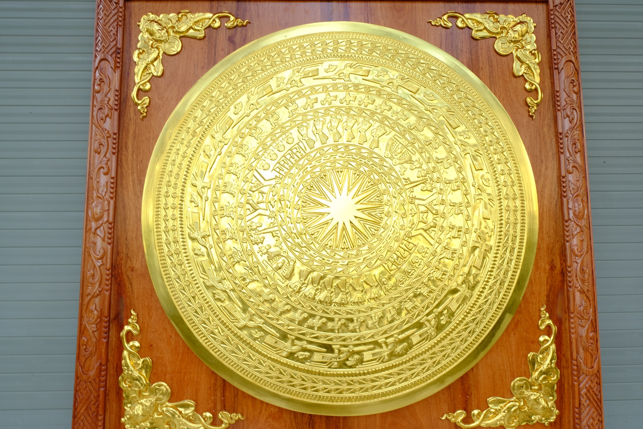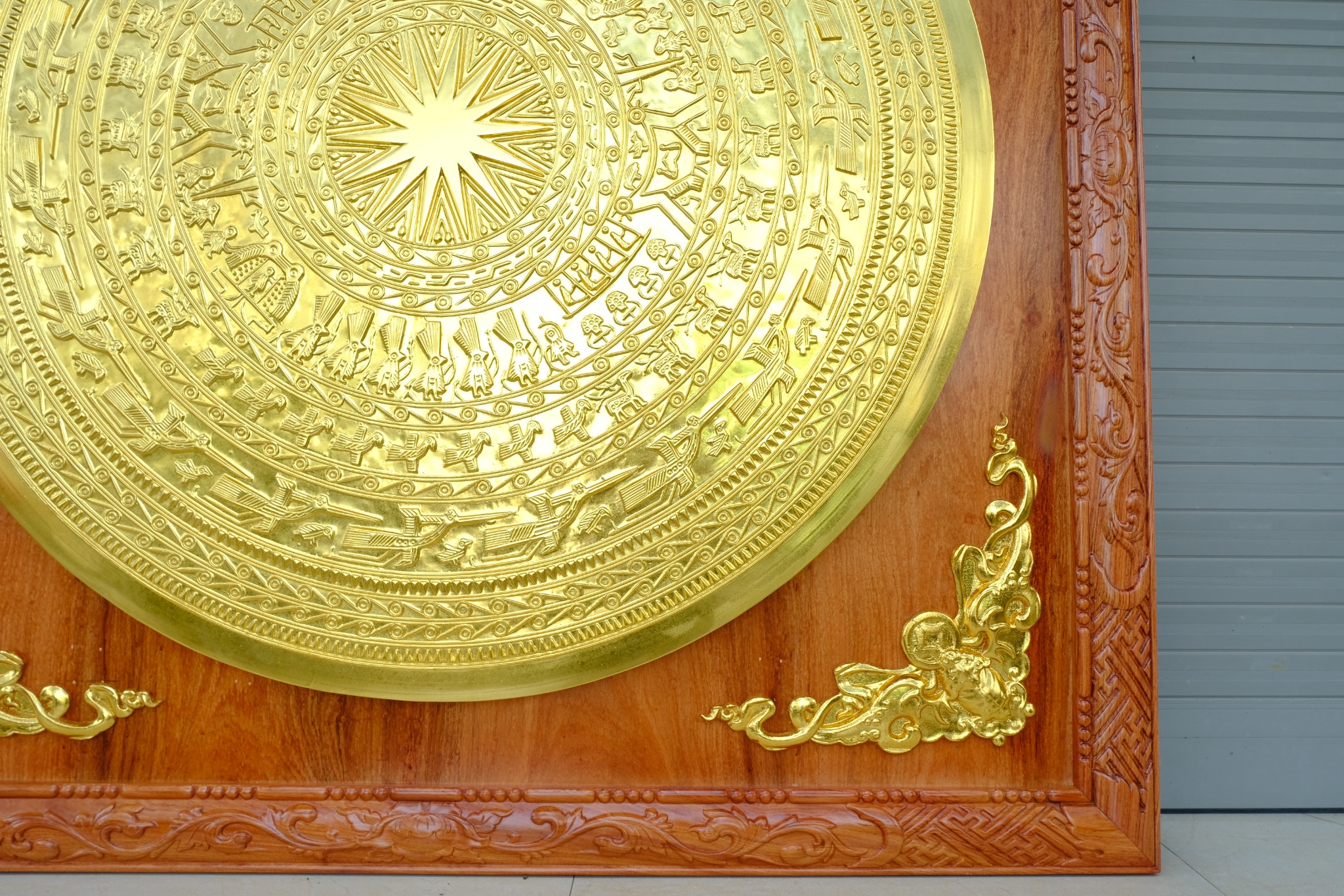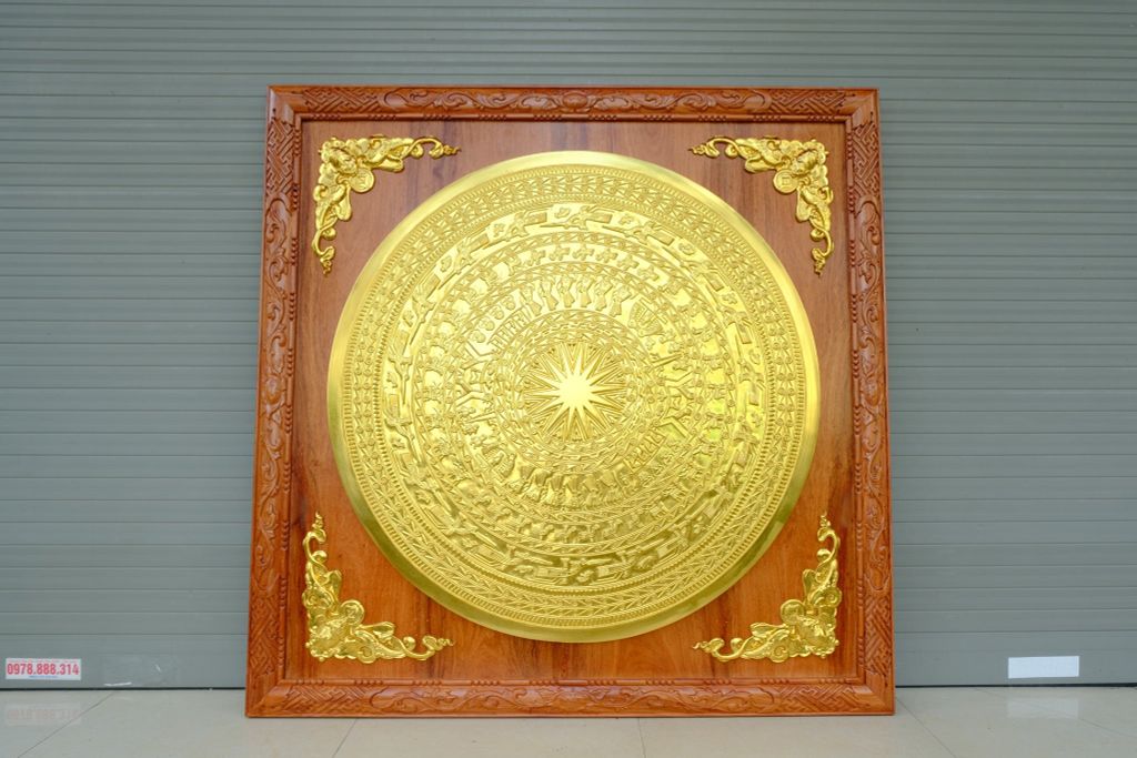 | Quy cách | - Khung tranh làm bằng gỗ hương đá - Bo góc dơi ngậm tiền dát vàng liên khung gỗ - Mặt trống được làm bằng đồng đỏ đúc thủ công, hàng liền khối. Bảo hành chất lượng đồng vĩnh viễn - Toàn bộ được dát vàng 18k |