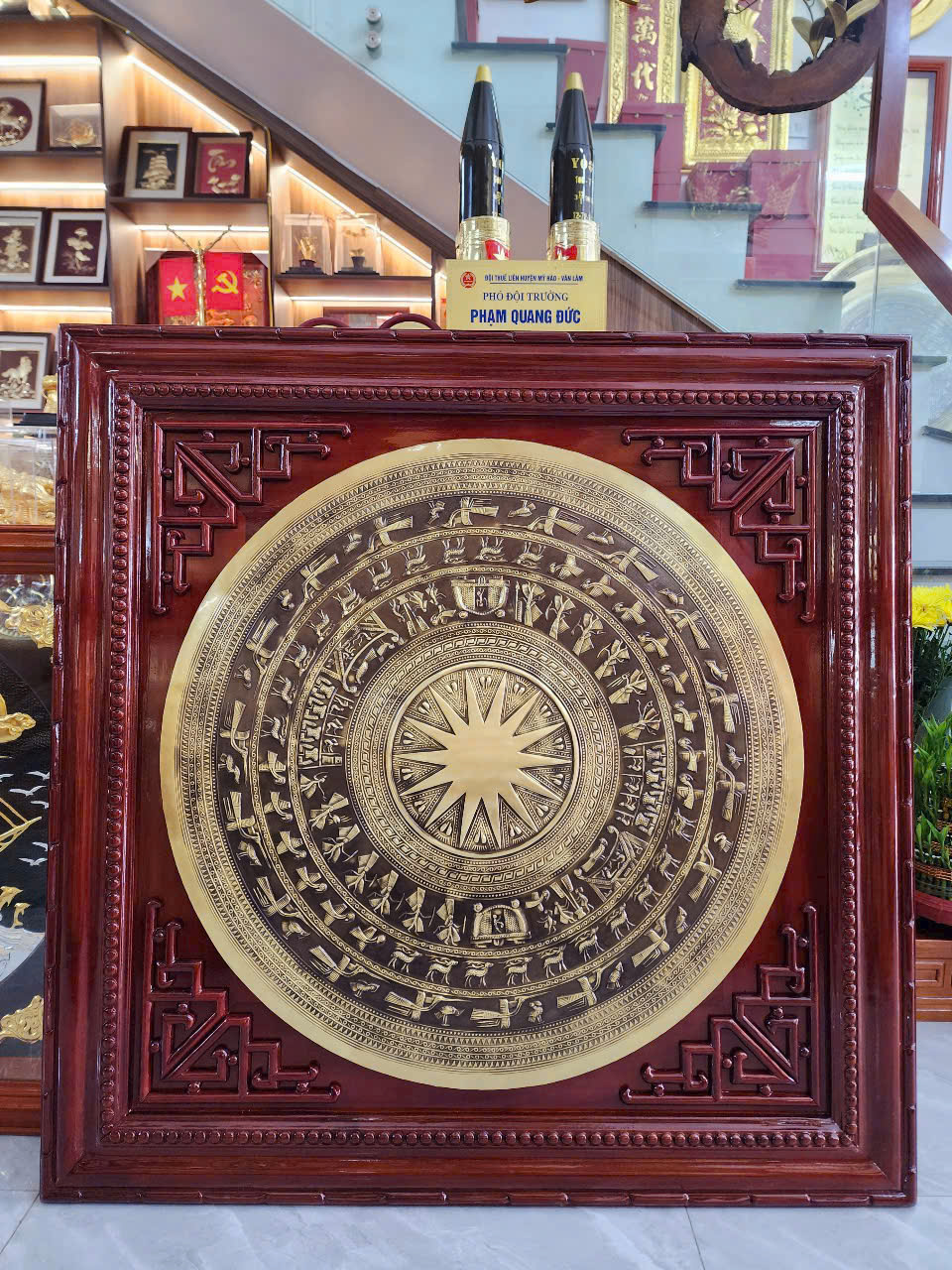 | Quy cách | - Khung gỗ được được làm bằng gỗ sồi nga đục sắc nét Gỗ chuẩn, không cong vênh, không mối mọt, không mắt gỗ. KT phủ bì khung gỗ: 88x88 cm - Mặt trống đường kính 60 được làm bằng đồng vàng nguyên tấm, thúc tay hoa văn trên mặt trống đồng. - Mặt trống và bo góc được dát vàng. |