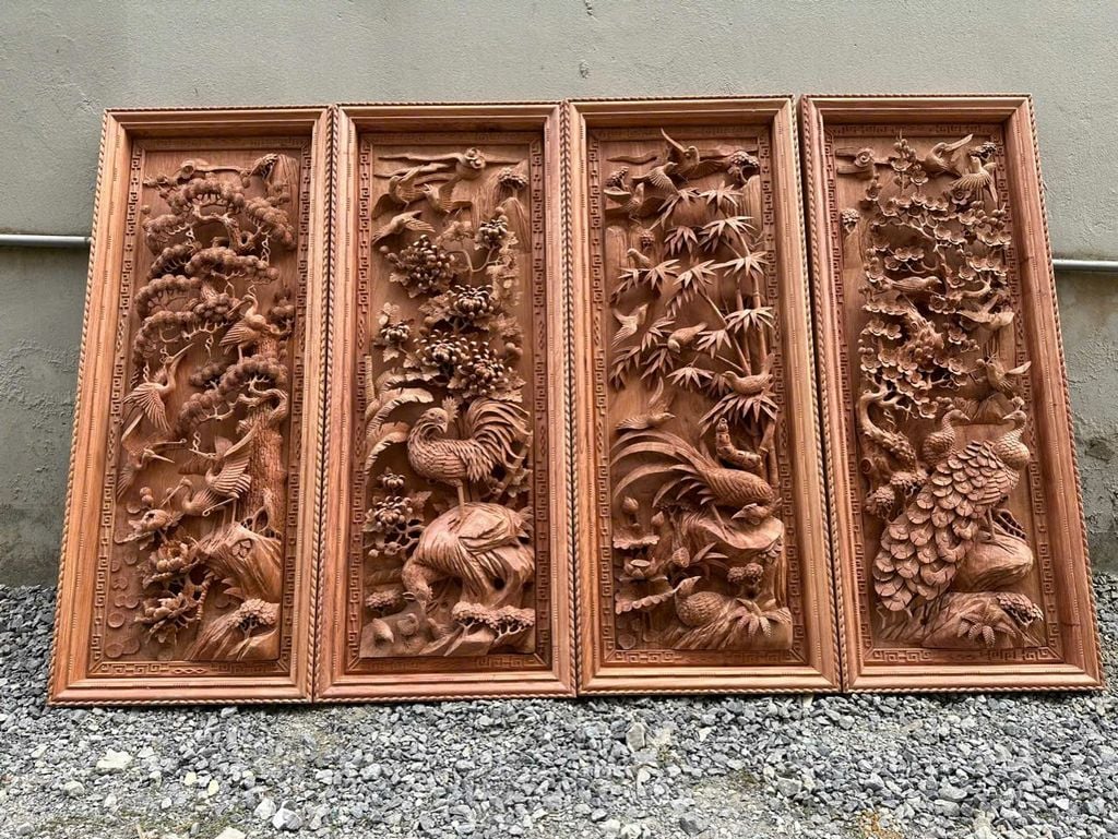 | Quy cách | - Tranh tứ quý được đục kênh bong sắc nét từ đôi bàn tay nghệ nhân nổi tiếng tạo nên thần thái của bức tranh - Ván gỗ nguyên khối - Đục tay kênh bong - Gỗ chuẩn không cong vênh, không rác, không mắt gỗ |
